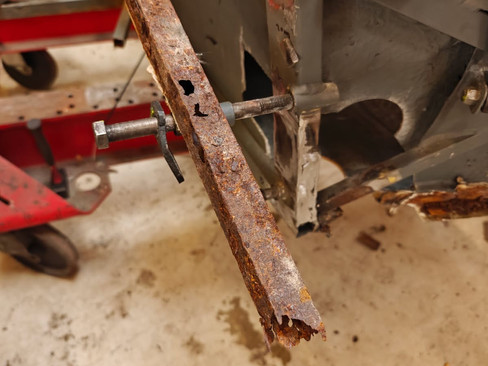 Michael and his Team have been working flat out to repair the damage sustained in the Viborg Classic as reported in the last Blog. Both damage to the front chassis frame was sustained, but on closer inspection, chassis tube corrosion from its many years of being left, often in less than idea storage was unearthed.